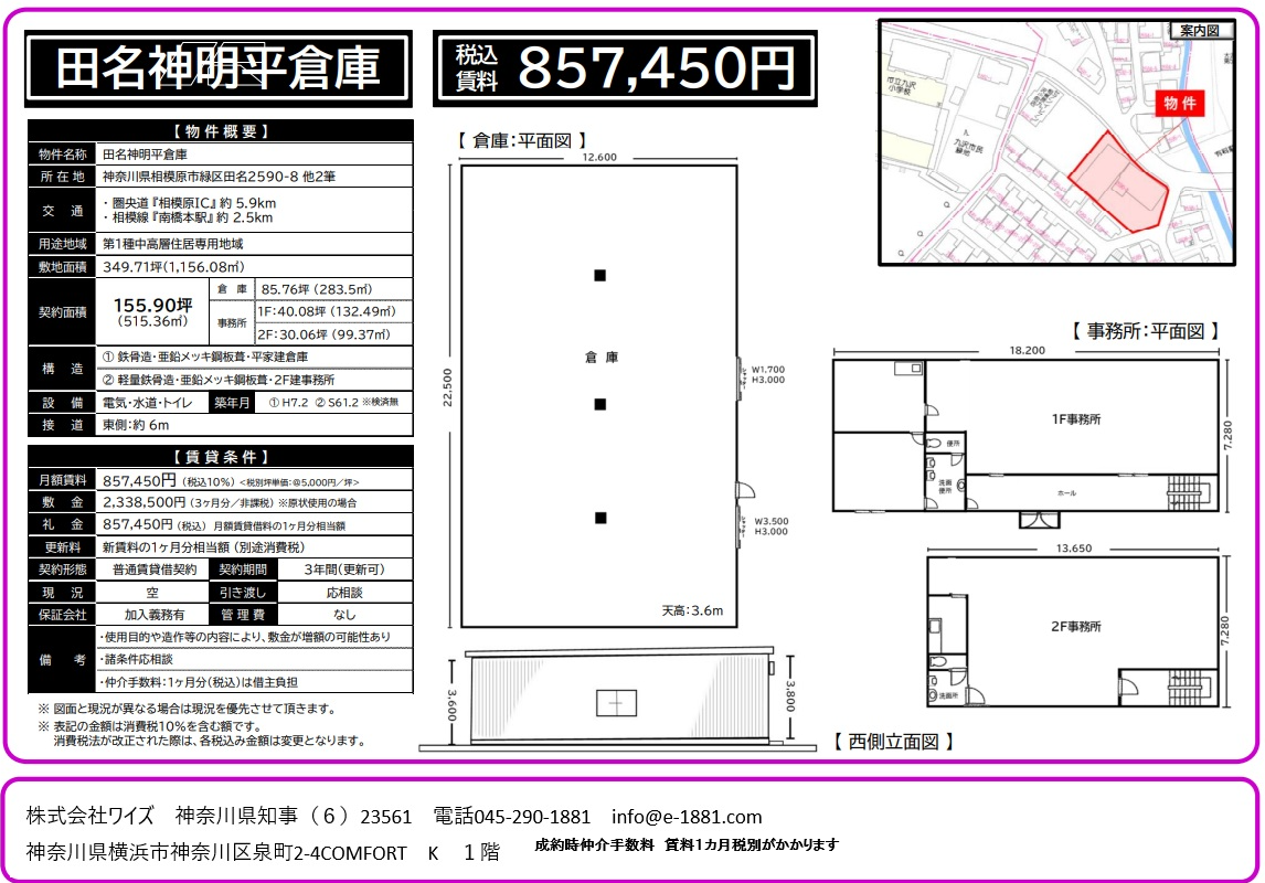 賃貸面積 約300坪 日本バーツ (東側平屋建倉庫237坪/西側2階建倉庫62坪) 国道246号線側道沿いに面した倉庫