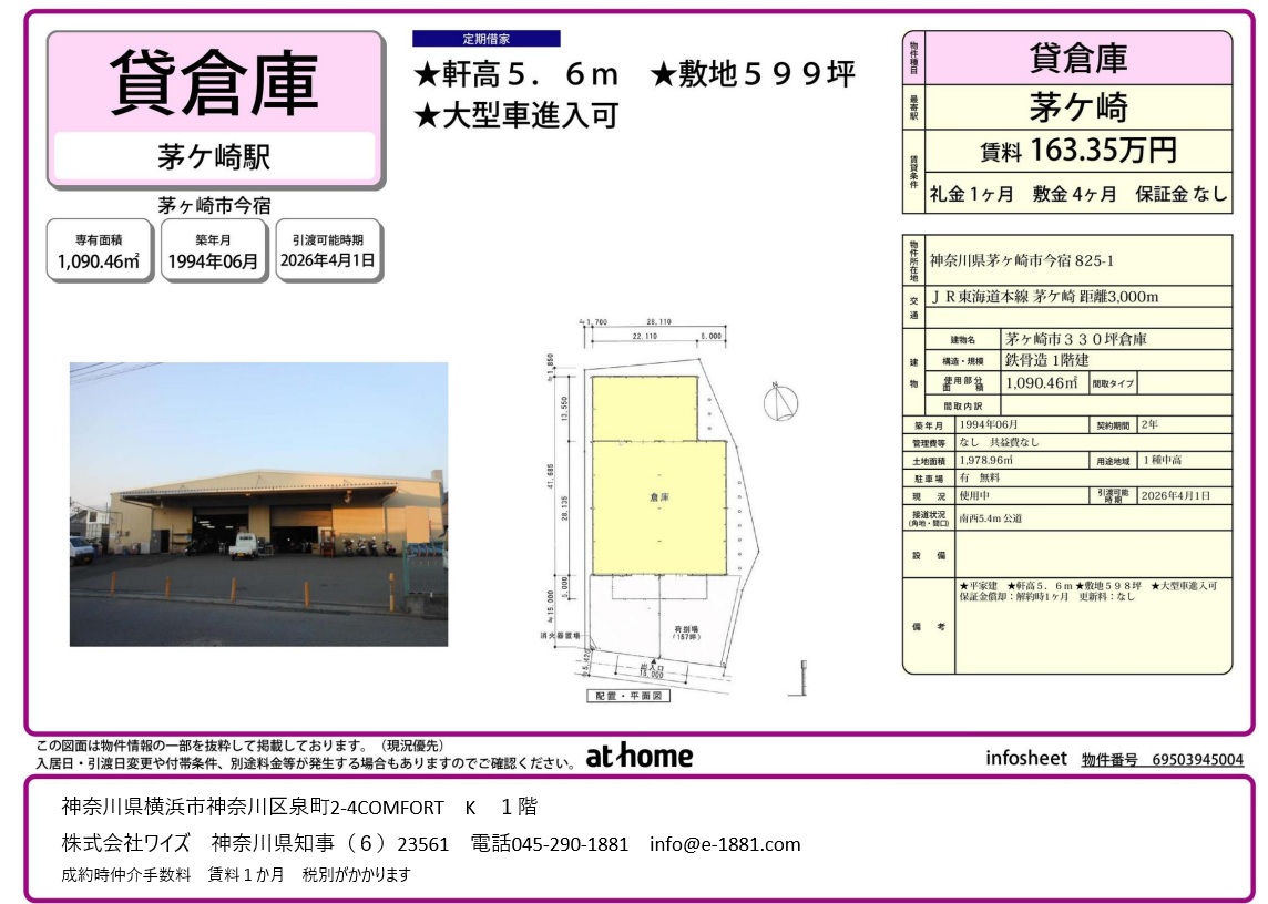 税込 天井高く使いやすい平家建倉庫約275坪 軒高約6m 内覧可能 検査済証あり 大型車出入可 南側8.6m道路 前面ヤード約88坪