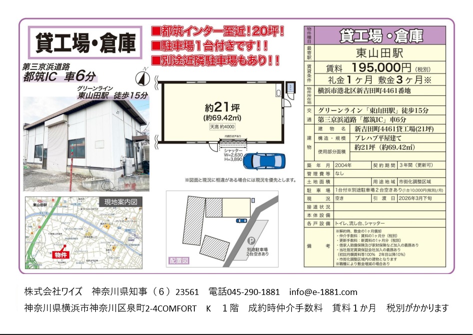 ◆谷在家駅徒歩17分! ◆天井高4m◆駐車スペースあり◆高速道路至近◆前面道路北東側6m ◆広い駐車スペースあり ◆電動シャッター付き