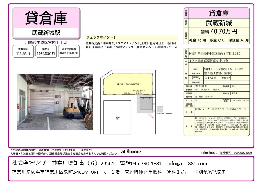 ◆主要採光面: 北東向き◆1フロア1テナント◆土曜日利用可、土日・祝日利 用可◆天井高2.5m以上◆電動シャッター◆車寄せスペース◆荷積みスペース