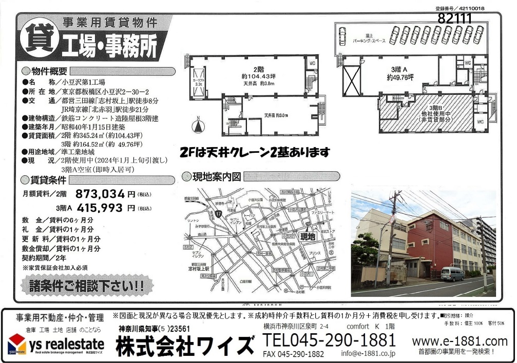 前面駐車スペース約100嵳り! ☆入口幅約4.6m 高さ約3.9m、 物件 住居表示 專有面積 構 造 築年数 概要 用途地域 天井高約6.1m~約7.0m! ☆首都高速川口線加賀ICまで約440m!
