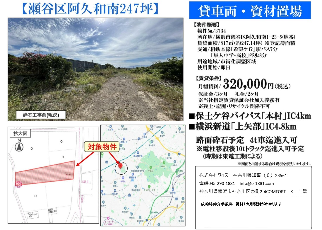 税込 車輛・資材置場に最適です! 保土ヶ谷バイパス下川井ICより約4劼領地 進入口コンクリート舗装 4t車進入可 敷地内砕石仕上げ